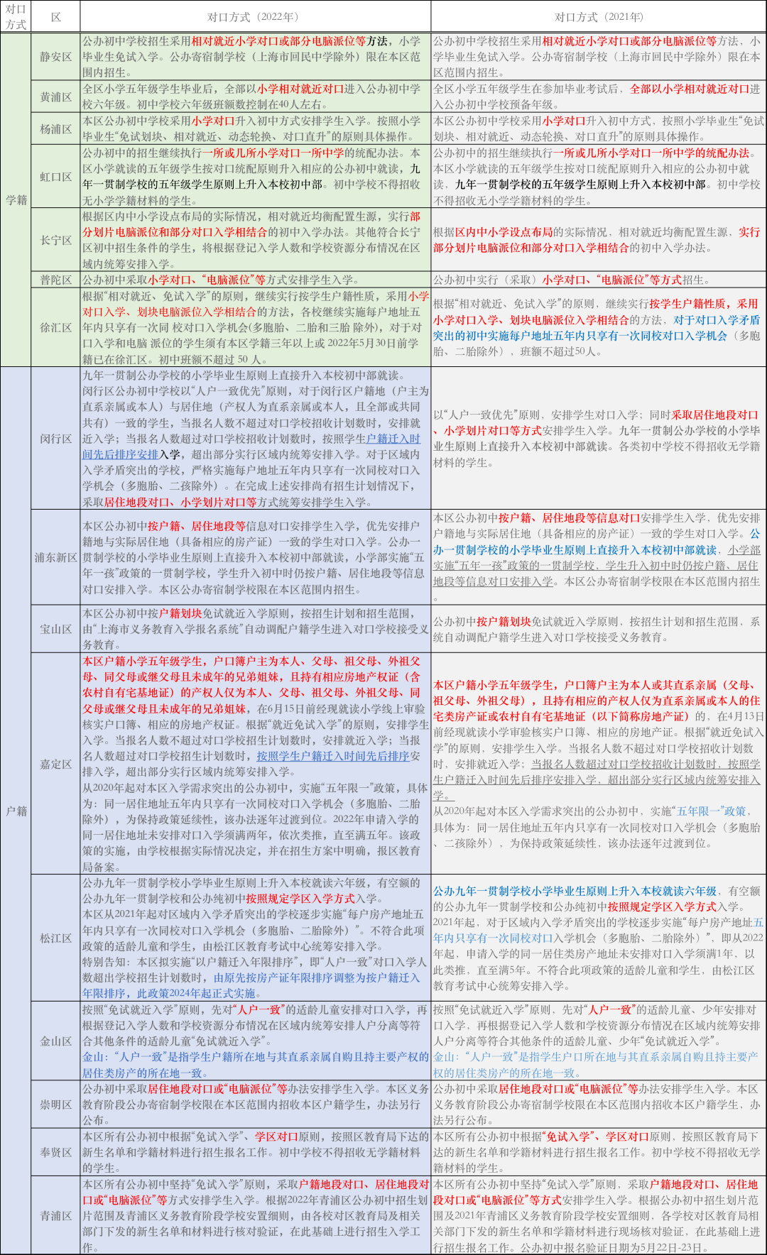 值得注意的是,哪怕是學籍對口的區,在小升初時也會參考戶籍情況進行統籌安排,例如徐彙、虹口。